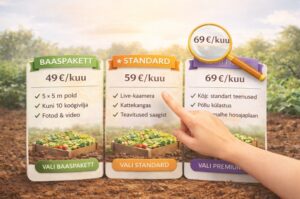 Sinu oma Põld, isegi kui elad linnas. Vali oma Põld Sina valid. Meie kasvatame. Sina jälgid ja saak jõuab koju. Kuidas see toimib? Pole midagi värskemat kui omal põllul kasvatatu! Vali pakett Vali endale sobiv teenusepakett ja alusta oma põlluga. Vali aedviljad Vali välja aedviljad, mida soovid kasvatada. Jälgi kasvu veebis Jälgi oma põllu kasvu veebis reaalajas. Telli saak koju Esita tellimus veebis ning saak tuuakse sulle koju. Mis ma saan? ✓ Kohalik ja päris toit ✓ Näed kõike reaalajas ✓ Live-kaamera ja fotod ✓ Mitmekordne värske saak ✓ Hariv sisu ja tugi Vali Pakett